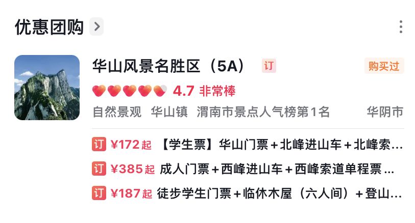 全程徒步游览华山,是最“热辣滚烫·暴汗燃脂”的路线。由玉泉院-华山门处检票。