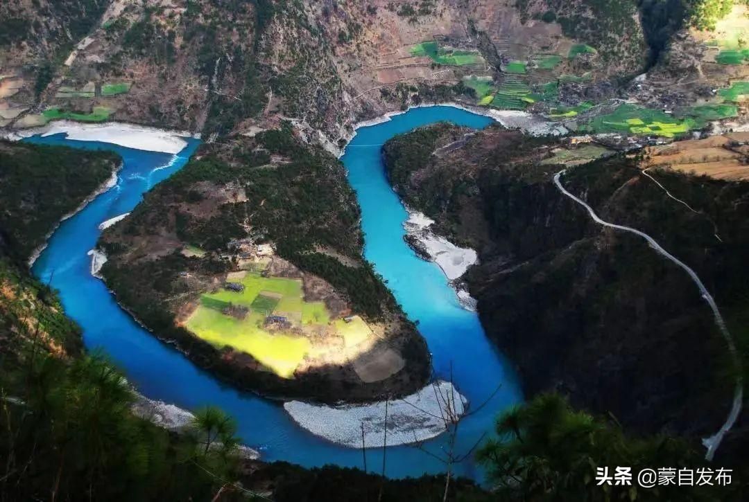 这里是远近闻名的弯道,是怒江的代表性美景。这里急流气势磅礴,自然风光旖旎,江湾环绕的半岛形似马蹄状,上面坐落着一个名为坎桶村的小村子,散布着农田、人家,宛若峡谷桃源。