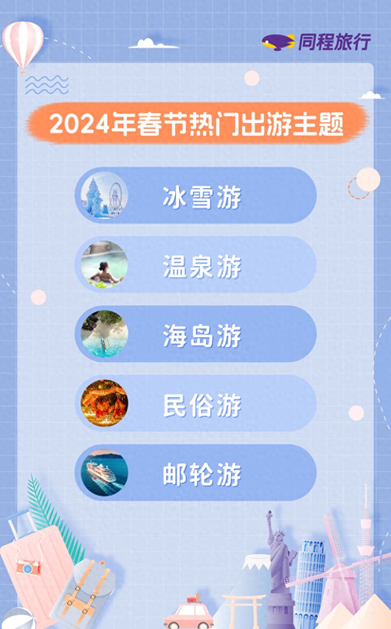 2024年春节假期,热度最高的出游主题为冰雪游。滑冰、滑雪等冰雪体验项目,以及各类冰雪观光项目均受到游客的较多关注。同程旅行数据显示,哈尔滨、漠河、延吉等地的假期旅游热度同比涨幅均超过100%。为了给用户提供丰富的冰雪旅行体验,同程旅行已与北京什刹海冰场、颐和园冰场、紫竹院冰场等10家热门户外冰场达成合作,用户可以通过同程旅行官方App、小程序等渠道购票体验冰车、滑冰等丰富的冰上活动。