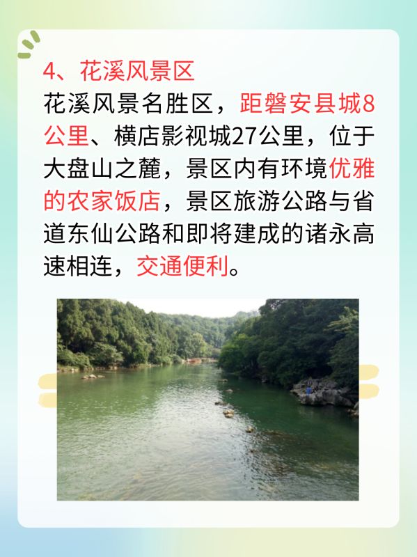花溪风景区:距离磐安县城8公里、横店影视城27公里,位于大盘山之麓,有农家饭店,交通便利。