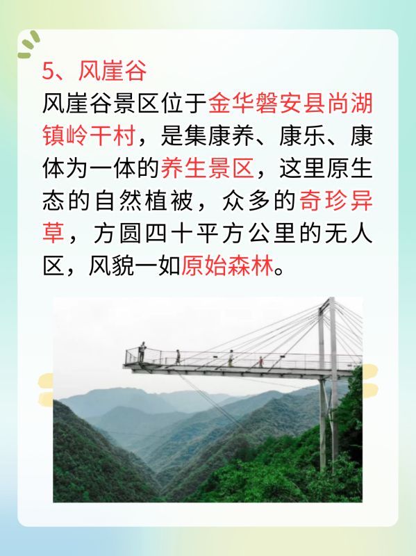 风崖谷:位于金华磐安县尚湖镇岭干村,是集康养、康乐、康体为一体的养生景区,拥有原生态的自然植被和奇珍异草。
