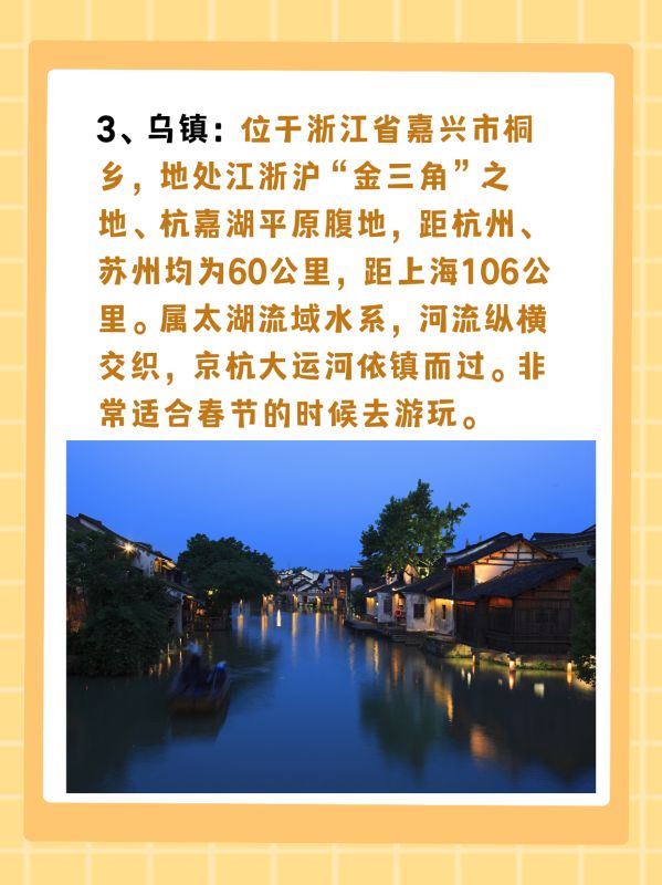3、乌镇:位于浙江省嘉兴市桐乡,地处江浙沪“金三角”之地、杭嘉湖平原腹地,距杭州、苏州均为60公里,距上海106公里
