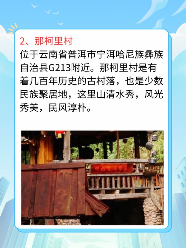 位于云南省普洱市宁洱哈尼族彝族自治县G213附近。那柯里村是有着几百年历史的古村落,也是少数民族聚居地,这里山清水秀,风光秀美,民风淳朴。