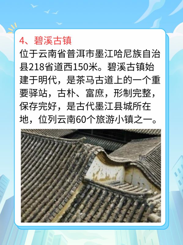 位于云南省普洱市墨江哈尼族自治县218省道西150米。碧溪古镇始建于明代,是茶马古道上的一个重要驿站,秀美、古朴、富庶,形制完整,保存完好,是古代墨江县城所在地,位列云南60个旅游小镇之一。
