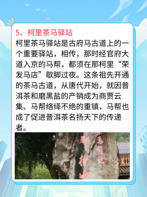 柯里茶马驿站是古府马古道上的一个重要驿站,相传,那时经官府大道入京的马帮,都须在那柯里“荣发马店”歇脚过夜。这条祖先开通的茶马古道,从唐代开始,就因普洱茶和磨黑盐的产销成为商贾云集、马帮络绎不绝的重镇,马帮也成了促进普洱茶名扬天下的传递者。