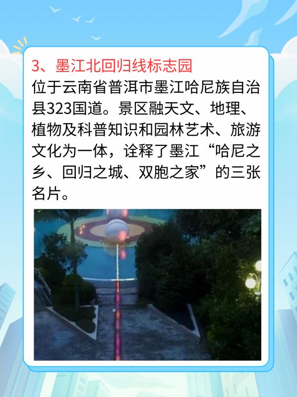 位于云南省普洱市墨江哈尼族自治县323国道。景区融天文、地理、植物及科普知识和园林艺术、旅游文化为一体,诠释了墨江“哈尼之乡、回归之城、双胞之家”的三张名片。
