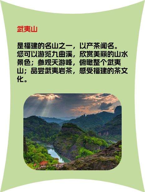 2. 武夷山:位于福建北部,是中国著名的风景名胜区之一。这里有茂密的森林、清澈的溪流和壮丽的瀑布,还有世界文化与自然遗产——武夷山茶文化。