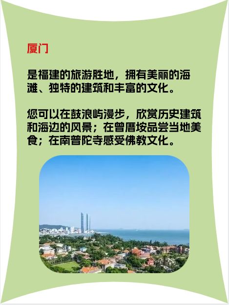 厦门:厦门是福建的旅游胜地,拥有美丽的海滩、独特的建筑和丰富的文化。您可以在鼓浪屿漫步,欣赏历史建筑和海边的风景;在曾厝垵品尝当地美食;在南普陀寺感受佛教文化。