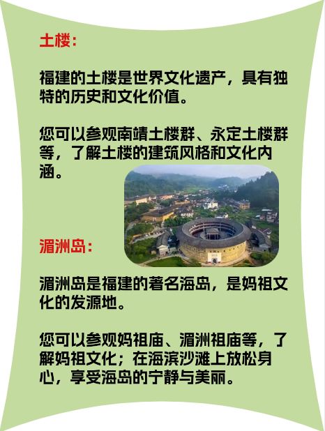 土楼:福建的土楼是世界文化遗产,具有独特的历史和文化价值。您可以参观南靖土楼群、永定土楼群等,了解土楼的建筑风格和文化内涵。