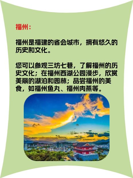 福州:福州是福建的省会城市,拥有悠久的历史和文化。您可以参观三坊七巷,了解福州的历史文化;在福州西湖公园漫步,欣赏美丽的湖泊和园林;品尝福州的美食,如福州鱼丸、福州肉燕等。