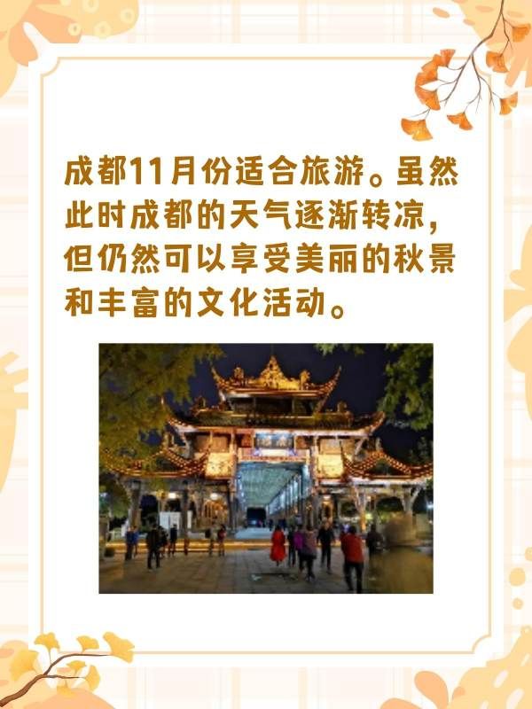 成都11月份适合旅游。虽然此时成都的天气逐渐转凉,但仍然可以享受美丽的秋景和丰富的文化活动。