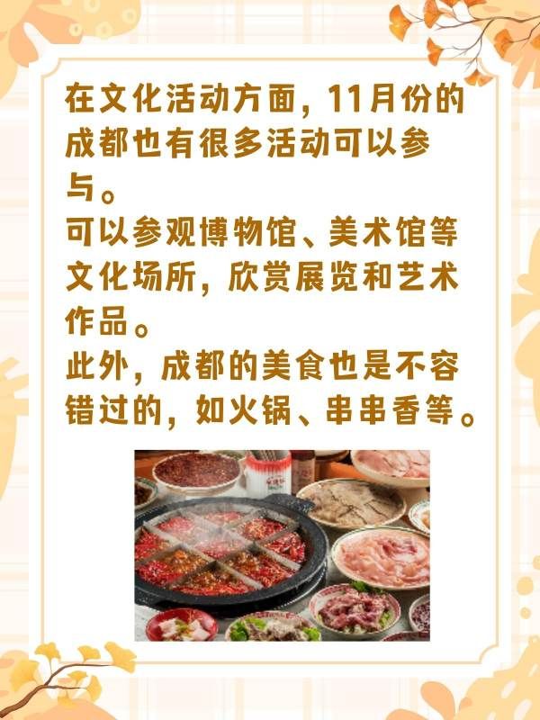 在文化活动方面,11月份的成都也有很多活动可以参与。可以参观博物馆、美术馆等文化场所,欣赏展览和艺术作品。此外,成都的美食也是不容错过的,如火锅、串串香等。