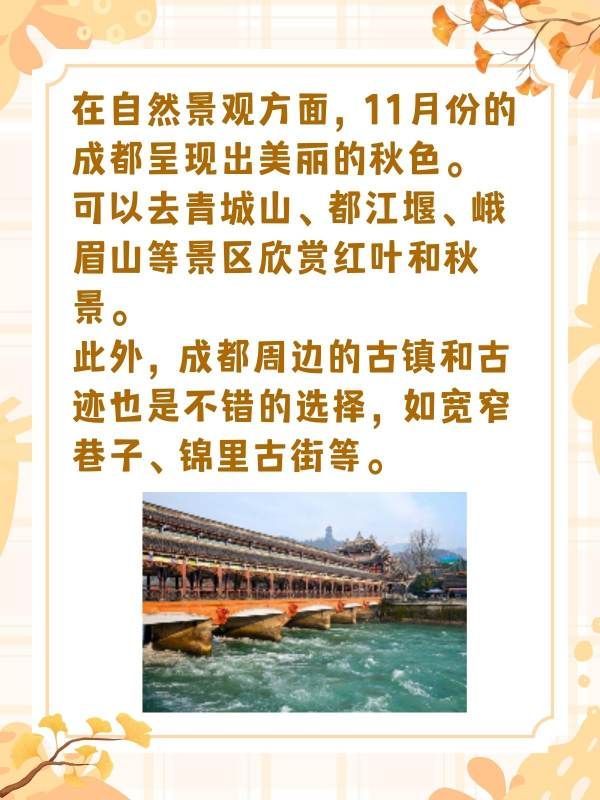 在自然景观方面,11月份的成都呈现出美丽的秋色。可以去青城山、都江堰、峨眉山等景区欣赏红叶和秋景。此外,成都周边的古镇和古迹也是不错的选择,如宽窄巷子、锦里古街等。