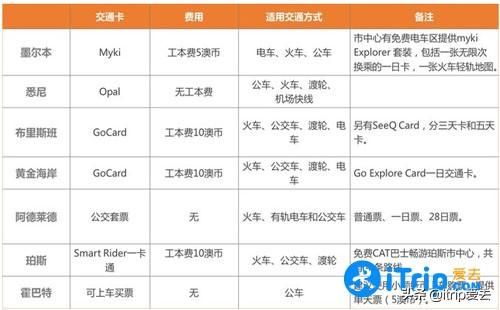 澳大利亚各大城市内的公共交通都比较简单,不外乎是电车、公交车、火车、轻轨等,其中悉尼也有部分交通是依靠渡轮完成的。并且,澳大利亚每个城市都有一张适用该城市所有交通方式的交通卡,具体请看下表。需要注意的是,澳大利亚的公交车不报站,甚至车上也没有电子报站牌的,需要乘客自己提前按响下车铃,千万别坐过站啦!上车也需要提前在站台招手示意司机停车。