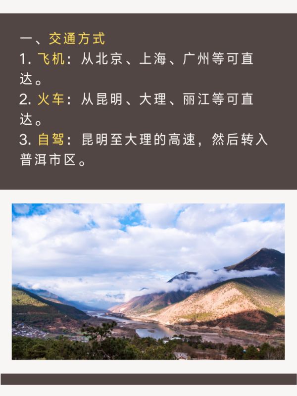 1. 飞机:从北京、上海、广州等城市可直达普洱机场。
