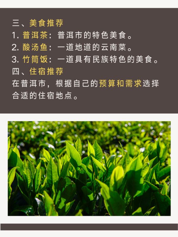 3.美食:普洱有很多地道的美食,其中以茶叶和烤肉最为有名。可以去当地的市场,体验一下当地人的生活。
