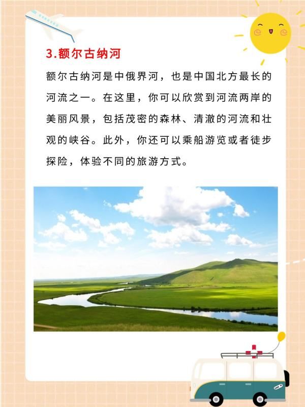 额尔古纳河是中俄界河,也是中国北方最长的河流之一。在这里,你可以欣赏到河流两岸的美丽风景,包括茂密的森林、清澈的河流和壮观的峡谷。此外,你还可以乘船游览或者徒步探险,体验不同的旅游方式。