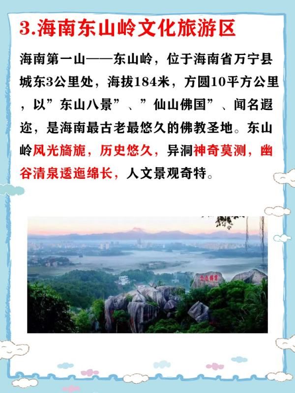 海南东山岭文化旅游区位于万宁县城东3公里处,被誉为“海南第一山”。这里有着悠久的佛教历史,是海南最古老、最悠久的佛教圣地。你可以在这里欣赏到美丽的自然风光,感受古老佛教文化的深厚底蕴。