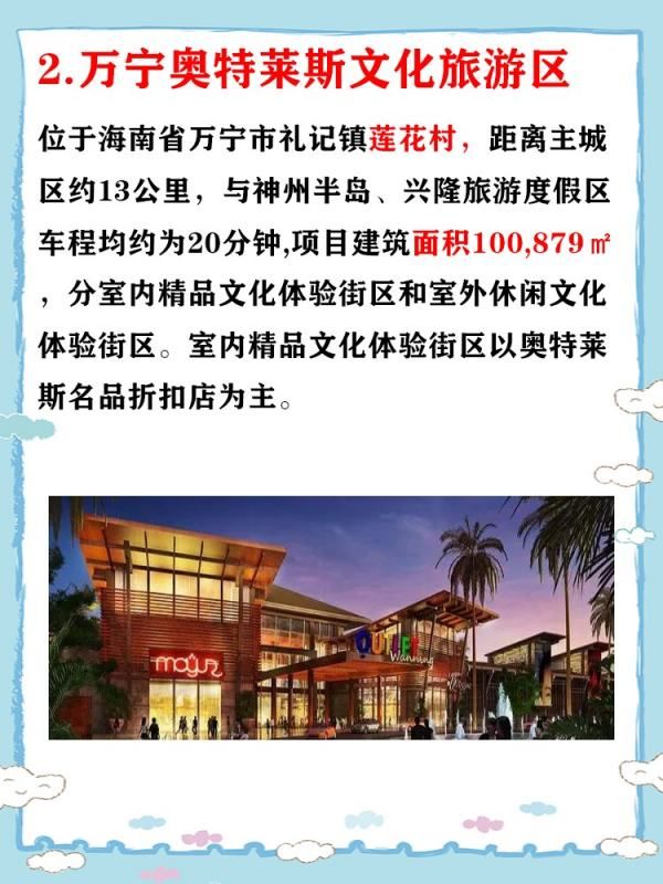 奥特莱斯文化旅游区位于万宁市礼记镇莲花村,距离主城区约13公里。这里拥有室内精品文化体验街区和室外休闲文化体验街区,以奥特莱斯名品折扣店为主,你可以在这里享受购物的乐趣,同时体验文化的魅力。