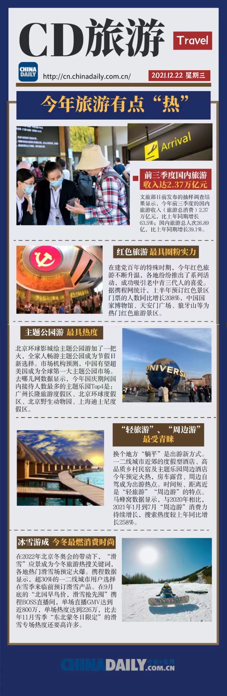 编者按:随着今年文旅复苏势头不断向好,游客的旅游习惯和出游的消费方式也随之发生一些新的变化。建党百年这个特殊时期以及2021年北京冬奥会的到来,带热了“红色旅游”和“冰雪游”,为旅游行业注入新的力量;而年轻一代的“轻旅游”、“微度假”、“周边游”和“主题公园游”等消费形式,更是让今年的旅游业更加活力十足。现在就让我们一起来回顾2021年的旅游热点,看看你参与了哪种旅游方式。