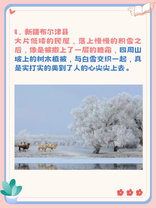 4、新疆布尔津县:像是被撒上了一层的糖霜,四周山坡上的树木植被,与白雪交织一起。