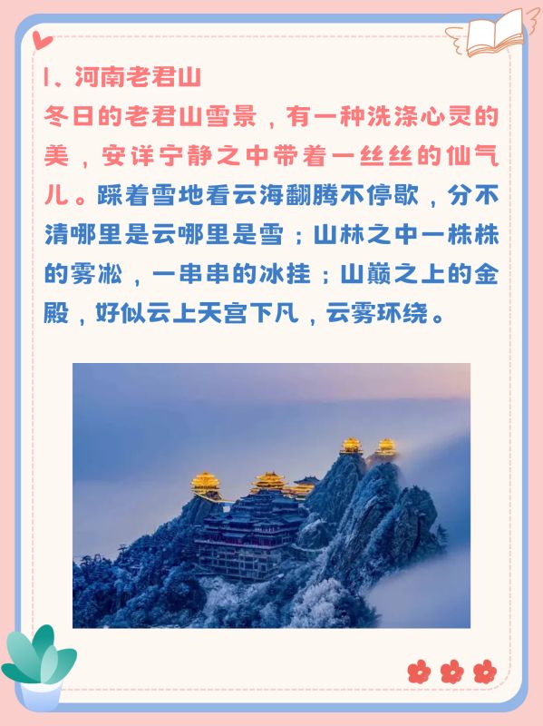 1、河南老君山:冬日的老君山雪景,有一种洗涤心灵的美,安详宁静之中带着一丝丝的仙气儿。