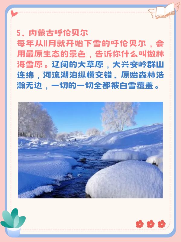 5、内蒙古呼伦贝尔:辽阔的大草原,大兴安岭群山连绵,河流湖泊纵横交错、原始森林浩瀚无边全都被白雪覆盖。