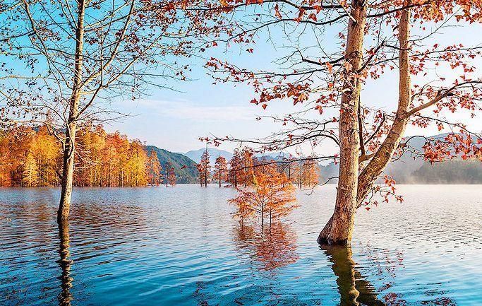 谷坦水库波澜不惊的水面,池杉安静挺立,一树树叶子,或锈红,或金黄,或黄绿掺半,在镜子般的水面反转倒影,呈现出一片绝美的秘境森林;