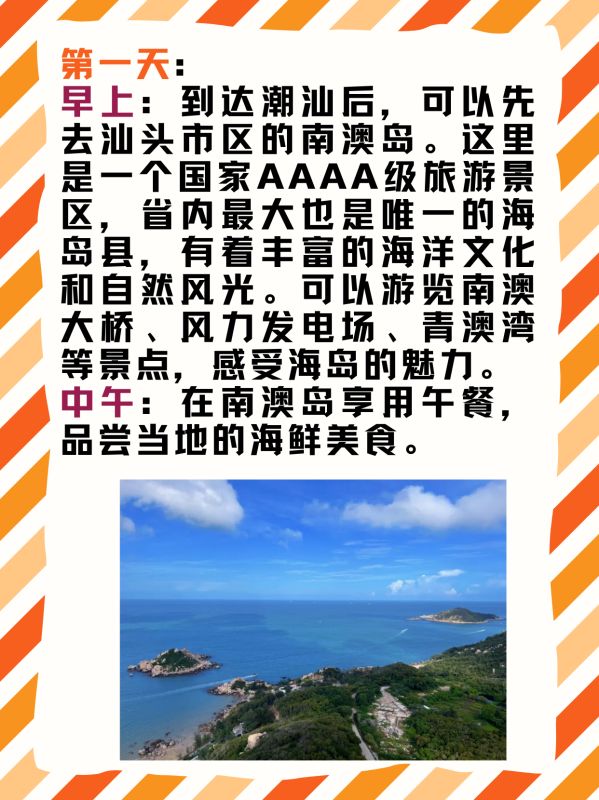 早上:到达潮汕后,可以先去汕头市区的南澳岛,感受海岛的魅力。