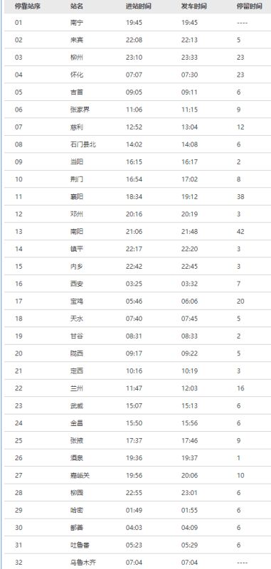 T282次列车由南宁开往乌鲁木齐,沿途经过下列车站。