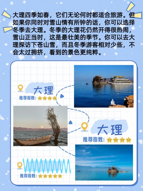 大理四季如春,它们无论何时都适合旅游。但如果你同时对雪山情有所钟的话,你可以选择冬季去大理。冬季的大理花仍然开得很热闹,雪山正当时,这是最壮美的季节。你可以去大理探访下苍山雪,而且冬季游客相对少些,不会太过拥挤,看到的景色更纯粹。