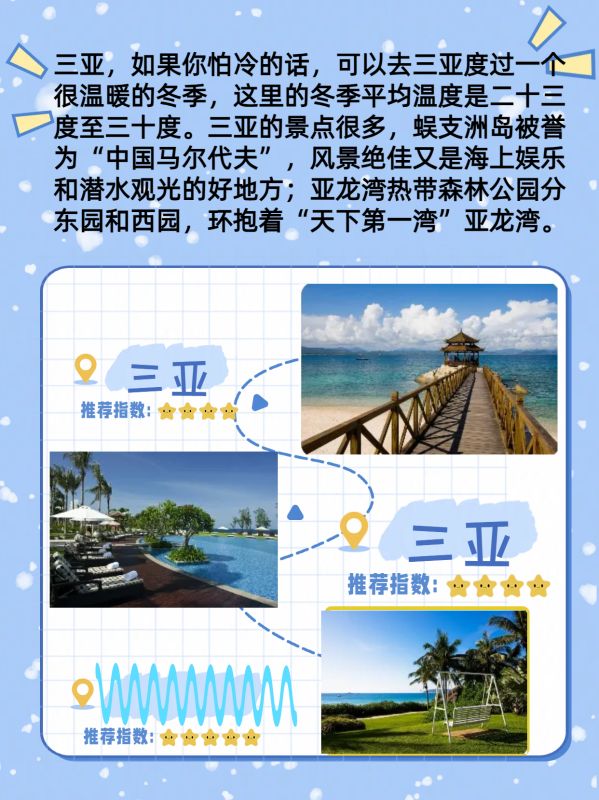三亚,如果你怕冷的话,可以去三亚度过一个很温暖的冬季,这里的冬季平均温度是二十三度至三十度。三亚的景点很多,蜈支洲岛被誉为“中国马尔代夫”,风景绝佳又是海上娱乐和潜水观光的好地方;亚龙湾热带森林公园分东园和西园,环抱着“天下第一湾”亚龙湾。