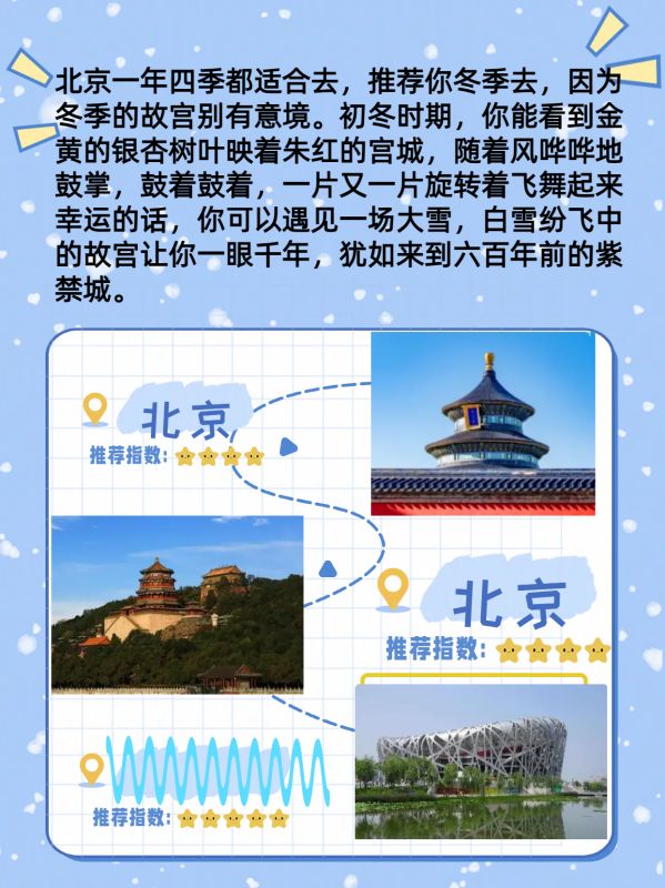 4. 北京:作为中国的首都,北京在冬季也会下雪,雪后的故宫、颐和园等名胜古迹呈现出别样的韵味。游客可以在这里体验传统的冬日风情。