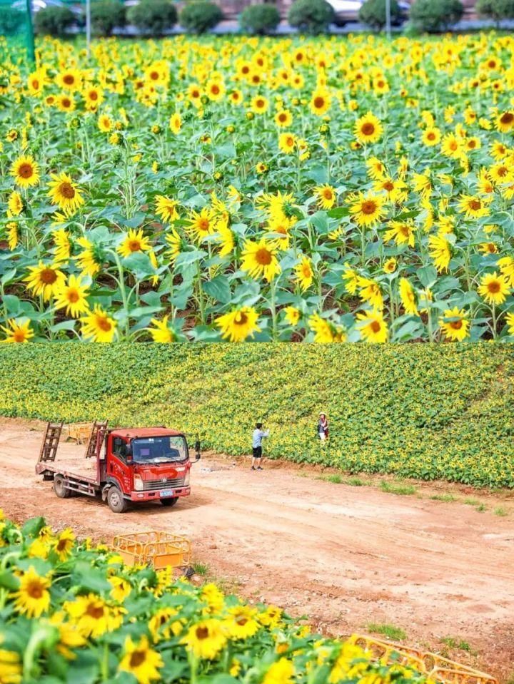 在新鸿广场边,新栽了一大片向日葵花海,虽已到初秋,但开得还算繁盛,像一个个金黄的小太阳,迷了过路人的眼。向日葵长在山坡上、小路边,挤挤挨挨,满满当当,好似落入了金色的梦境。推荐早晨或者傍晚来,那时彩霞满天,映着远处的青山,也映着这片向日葵,景色美得令人心醉。