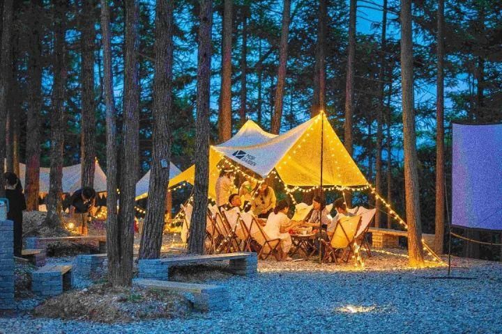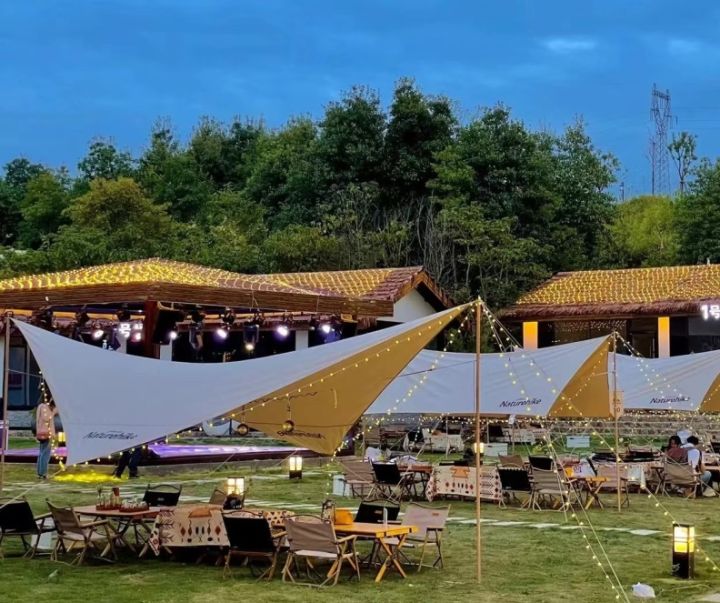 被树木环拥的星辰山,跨进帐篷是家,跨出帐篷是美景。抬头漫天繁星闯入眼帘,与草间的露营灯交相呼应,一片浪漫莹然。星空下的聚会,让有趣的灵魂自然相遇,和同样爱好的陌生人成为朋友,共度惬意时光。