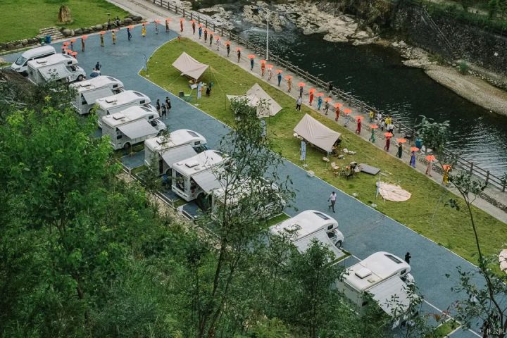 濛淤村不仅有好看的廊桥,还藏着一个免费的五星房车营地。营地有20余个停车位,停车位对面是一块大草坪,可以搭天幕搭帐篷,在溪畔玩水赏秋,不亦乐乎。