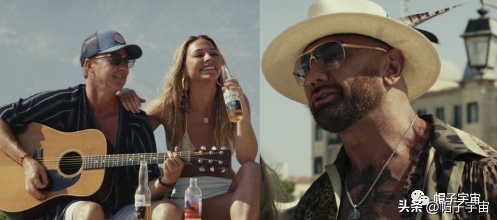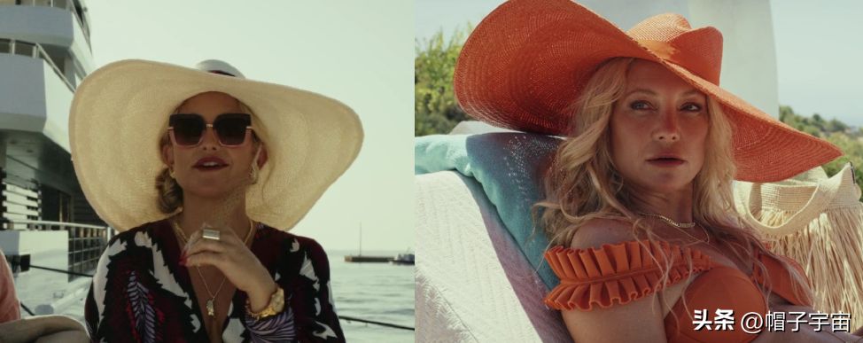 伯迪·杰伊,模特出身的时尚设计师。戴着两顶超宽帽檐的草帽度假。泳池这场戏份,桔色的泳衣和桔色草帽出镜非常吸睛。帽子和服装配色是亘古不变的黄金法则。因为模特和设计师的身份,选择的帽子略显夸张。演员身材高挑,轻松驾驭宽沿草帽。戴这种帽子度假帽子收纳可能需要更大的行李箱。