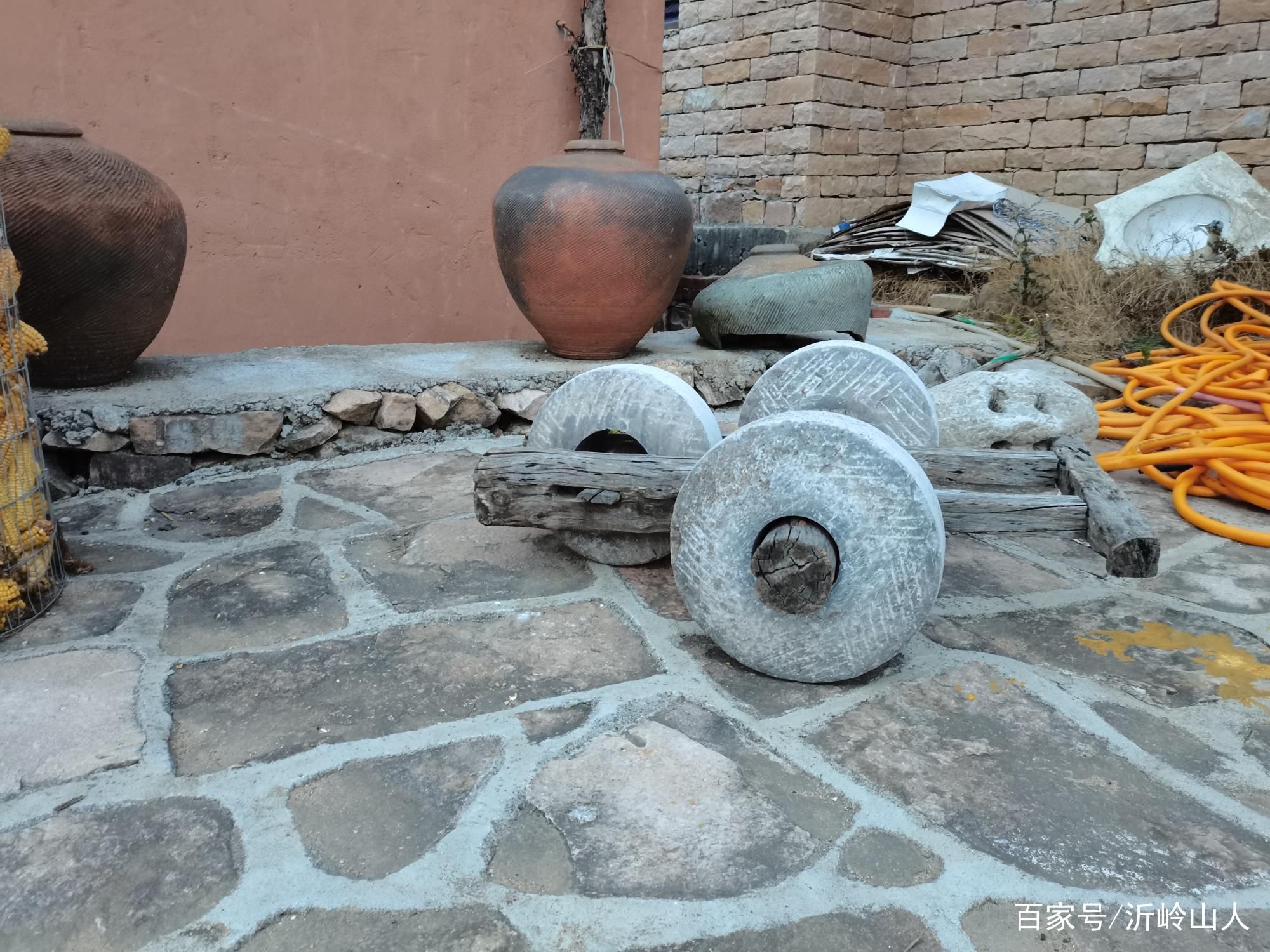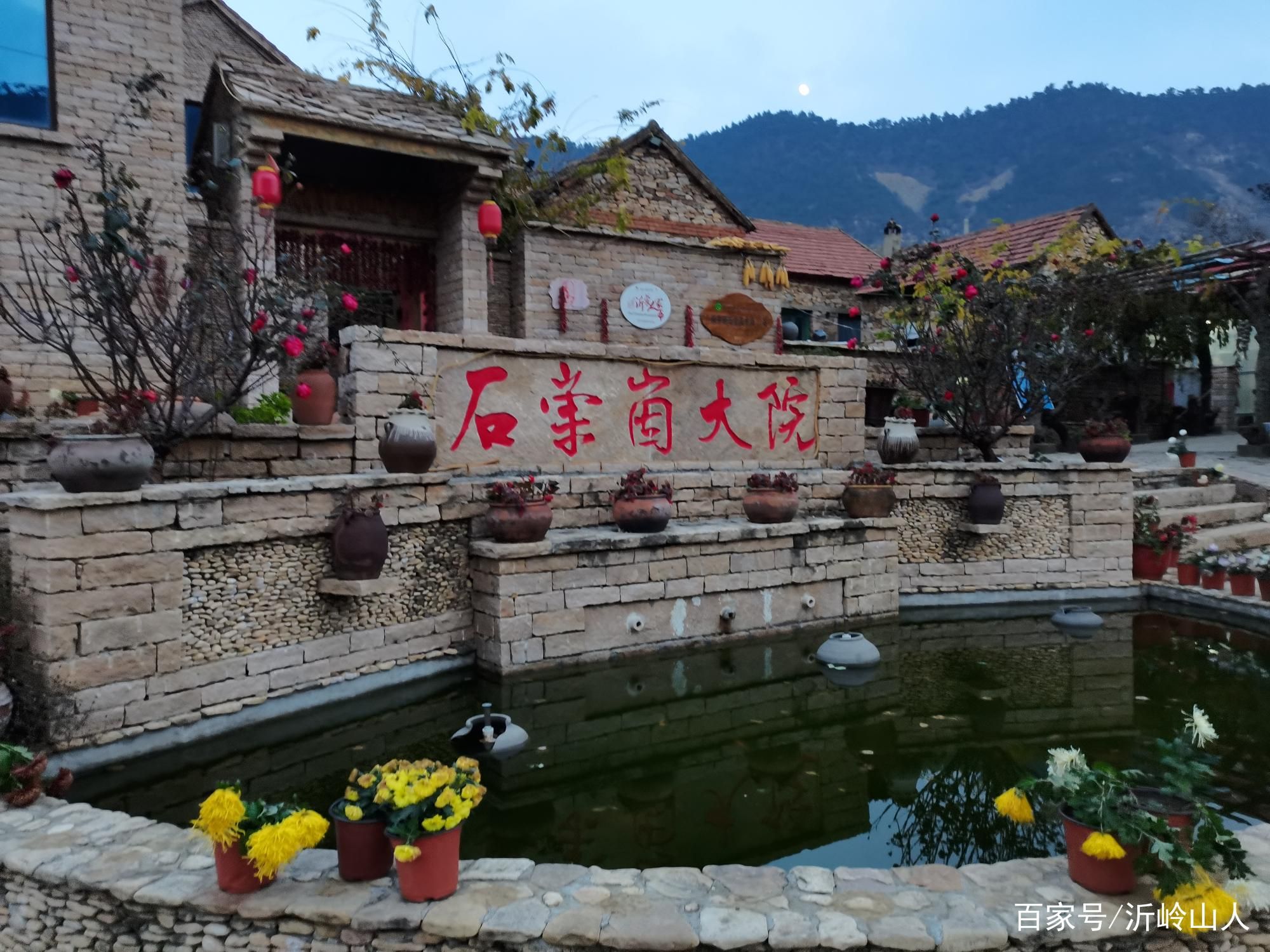 映入眼帘的便是这座水池,水质清澈养有很多锦鲤,为大院增添许多生机。石崇崮大院的石刻特别醒目,周边用岩石砌成,非常有规则的布置。玉米屯、农具、酒坛都摆放在院落内,有一种久违的亲切感。