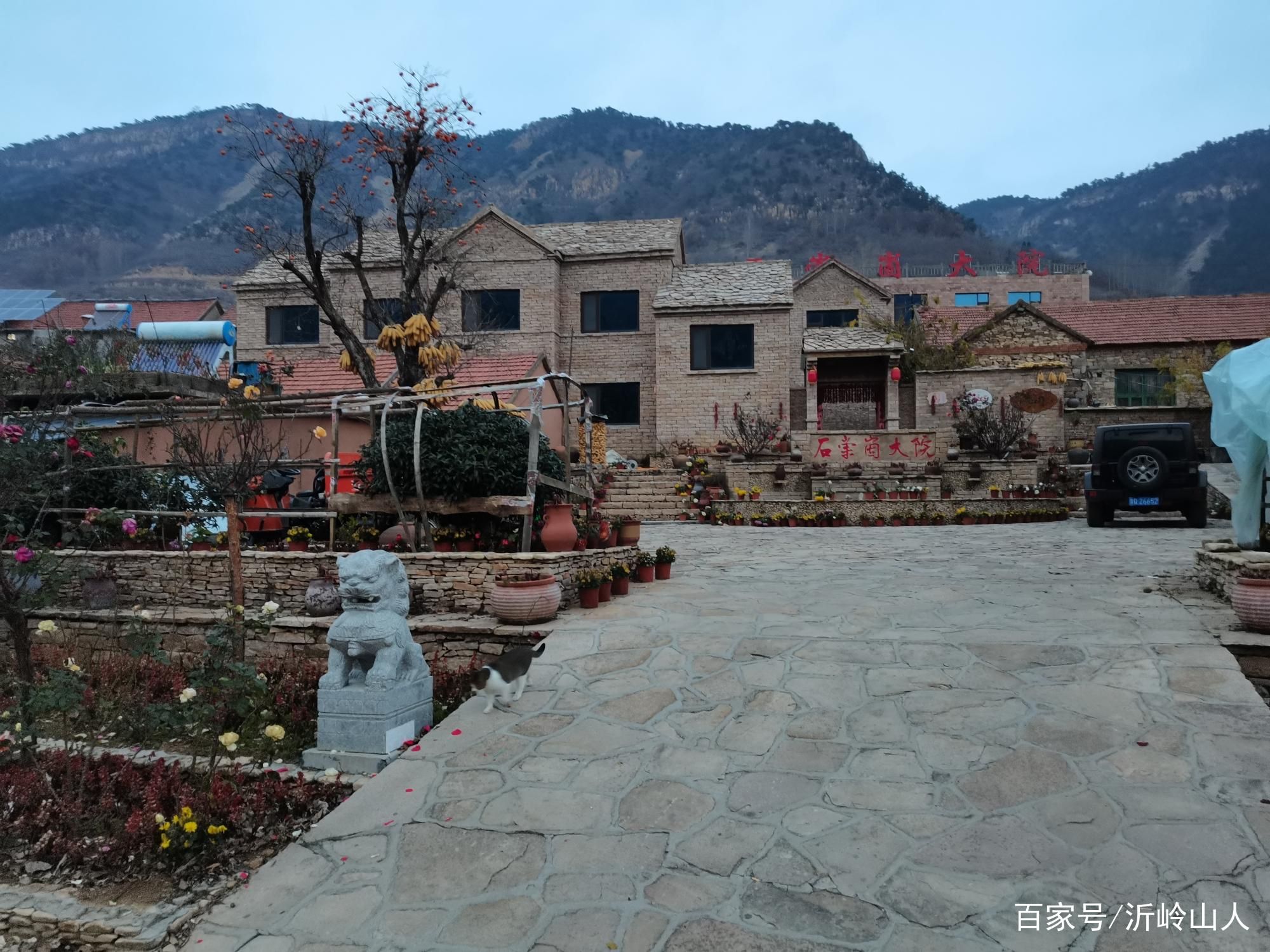 石崇崮大院就在村头不远,两座石狮矗立门前,院内的柿子树晾晒着许多玉米挂着树干上,大山、古树、农家小院组成美丽的画卷,一切是那么的自然和谐。