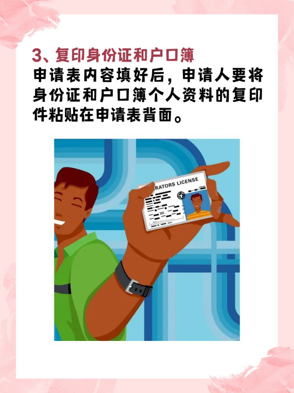 3、复印身份证和户口簿:将身份证和户口簿个人资料的复印件粘贴在申请表背面。