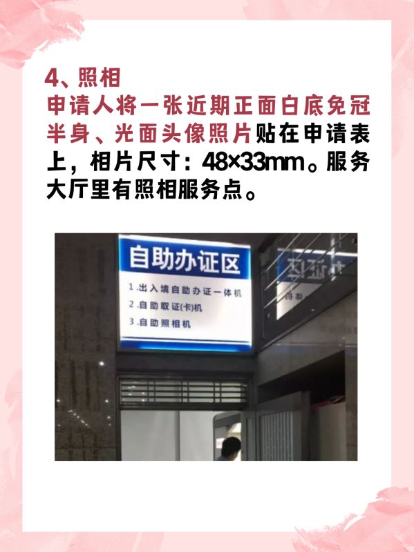 3、复印身份证、户口簿,照相申请表内容填好后,申请人要将身份证和户口簿个人资料的复印件粘贴在申请表背面。申请人将一张近期正面白底免冠半身、光面头像照片贴在申请表上,相片尺寸:48×33.服务大厅里有照相服务点。