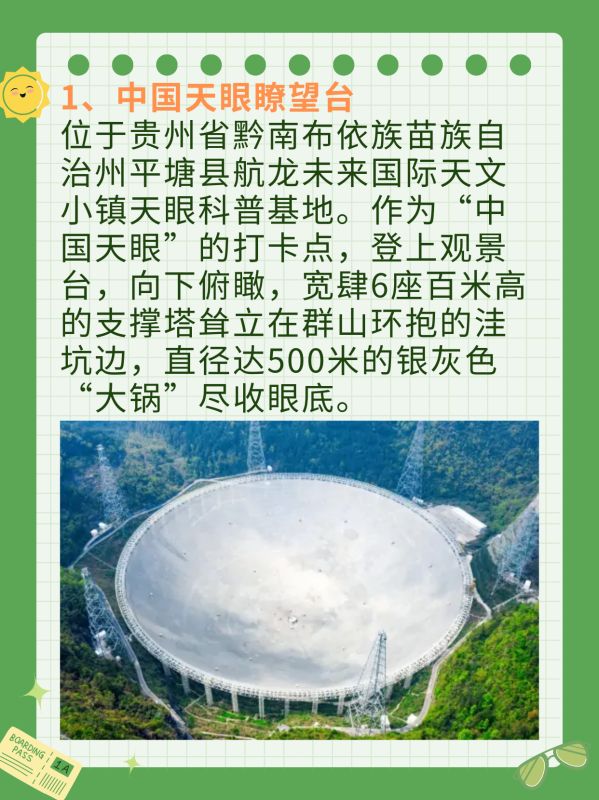 1、中国天眼瞭望台是“中国天眼”的打卡点,可以在观景台上俯瞰到6座百米高的支撑塔和直径达500米的银灰色“大锅”。
