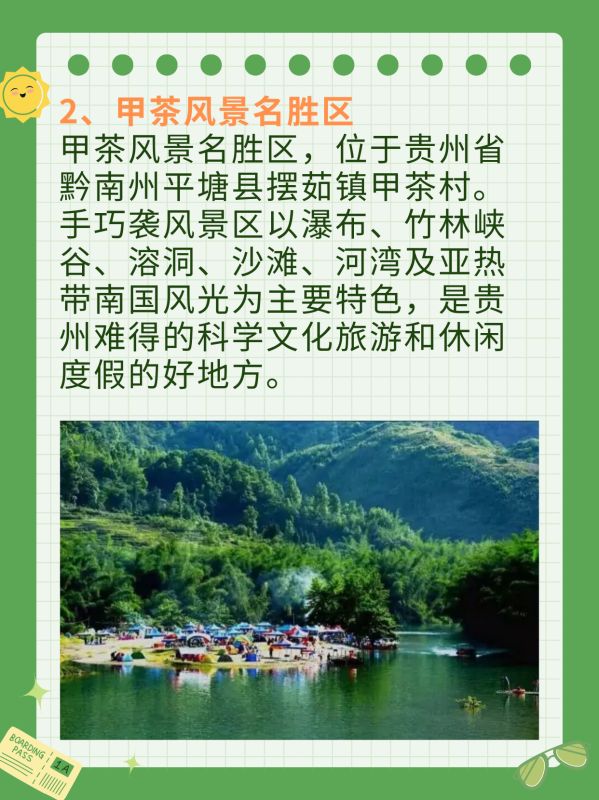 2、甲茶风景名胜区以瀑布、竹林峡谷、溶洞、沙滩、河湾及亚热带南国风光为主要特色,是贵州难得的科学文化旅游和休闲度假的好地方。