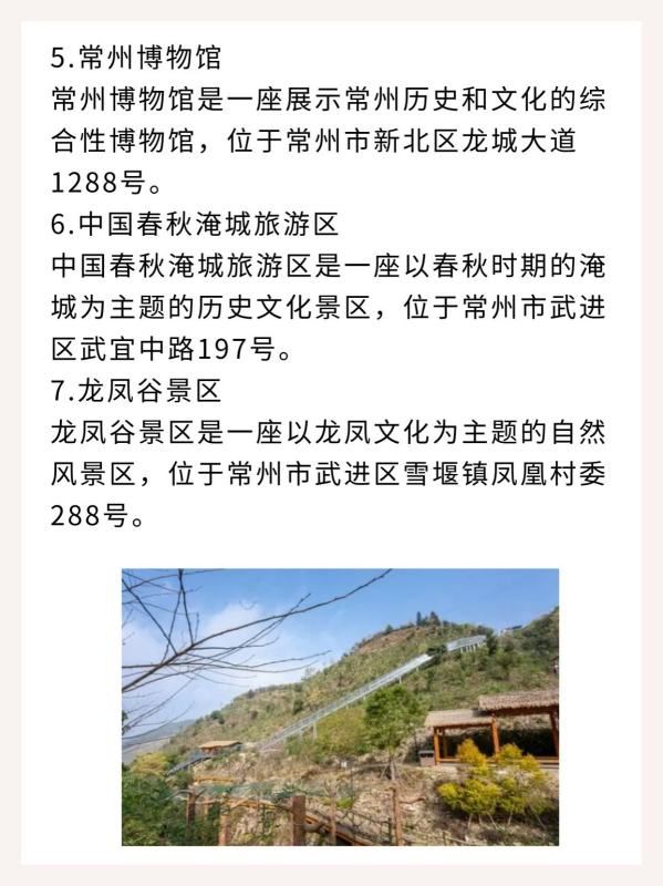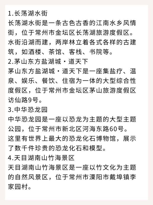 中国恐龙园:中国恐龙园是常州最著名的旅游景点之一,也是国内最大的恐龙主题公园。园区内有多种恐龙模型,包括一些可以动的机械恐龙,以及恐龙化石展览。此外,还有水上乐园、过山车等娱乐设施,非常适合家庭游客。