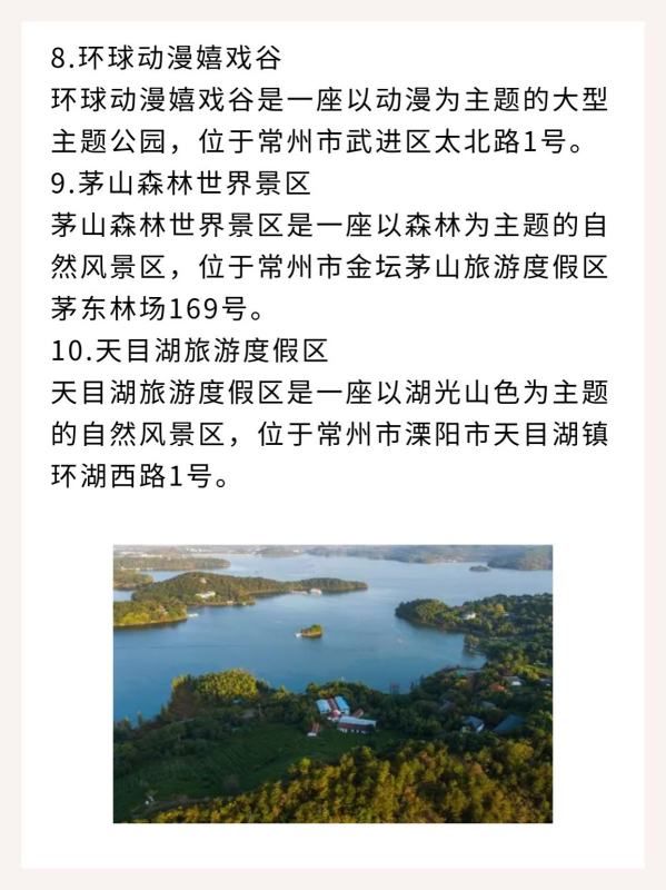 溧阳天目湖:位于常州市溧阳市,天目湖是一个风景秀丽的湖泊,湖光山色美不胜收。在这里,游客可以乘船游湖,参观岛屿,体验钓鱼和水上运动,或者在湖边度假村放松身心。