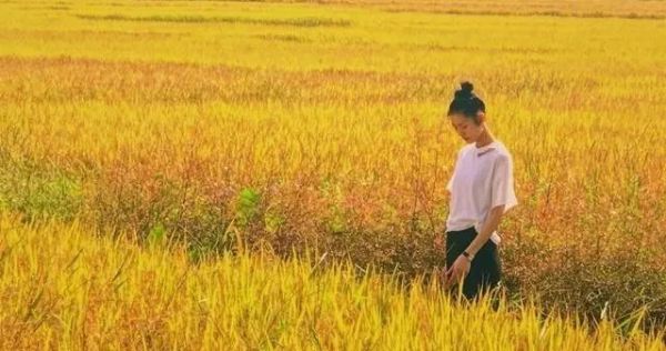 刘雯穿着白色T恤在金黄色稻田里拍照,远景近景都好看,同理穿着白色衣服在油菜花里拍照,也是一样好看。