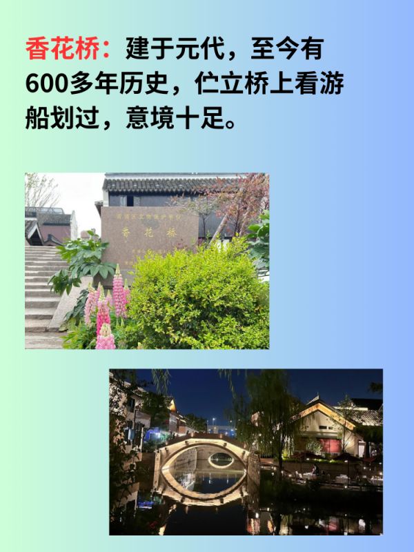 香花桥:建于元代,至今有600多年历史,伫立桥上看游船划过,意境十足。
