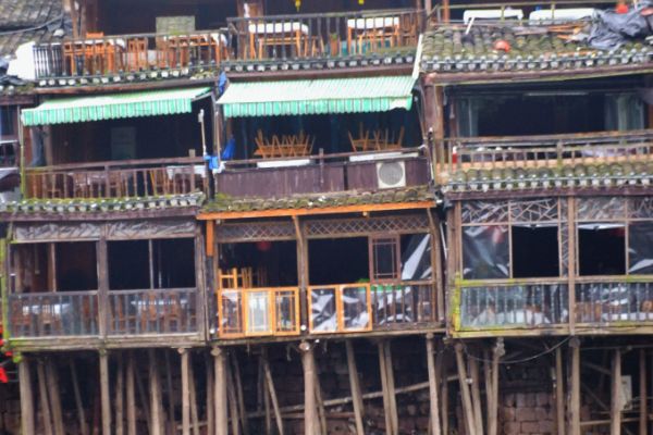 吊脚楼群座落在古城东南的回龙阁,前临古官道,后悬于沱江之上,是凤凰古城具有浓郁苗族建筑特色的古建筑群之一。该吊脚楼群全长240米,属清朝和民国初期的建筑,如今还居住着十几户人家。