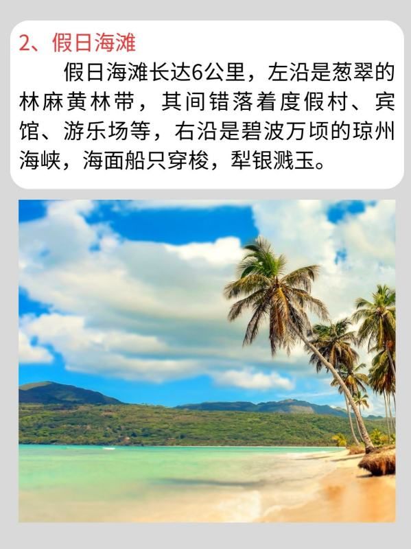 假日海滩长达6公里,左沿是葱翠的林麻黄林带,其间错落着度假村、宾馆、游乐场等,右沿是碧波万顷的琼州海峡,海面船只穿梭,犁银溅玉。