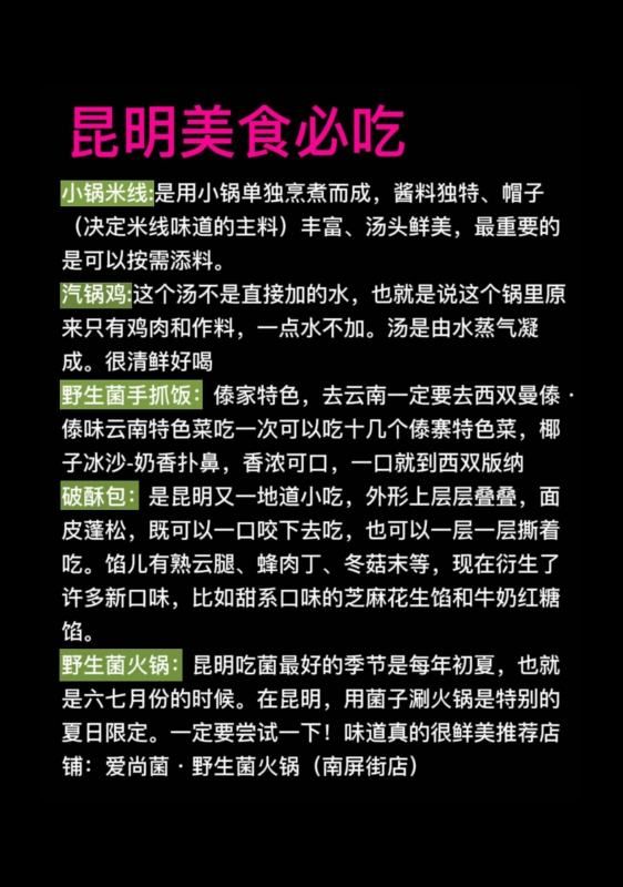 野生菌火锅:昆明吃菌最好的季节是每年初夏,也就是六七月份的时候。在昆明,用菌子涮火锅是特别的夏日限定。一定要尝试一下!味道真的很鲜美推荐店铺:爱尚菌·野生菌火锅(南屏街店)